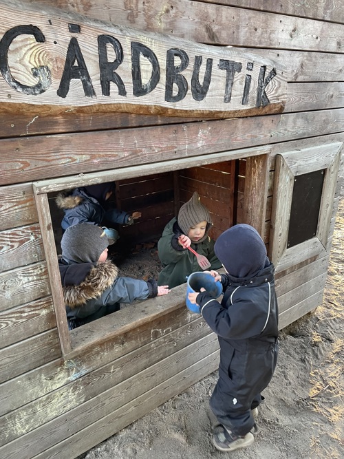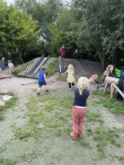 Alle børn, der ikke skal sove middagslur, er på legepladsen. Nogle gange er små grupper af børn inde og lege, hvis de er i gang med en god leg, eller hvis de har behov for indeleg.