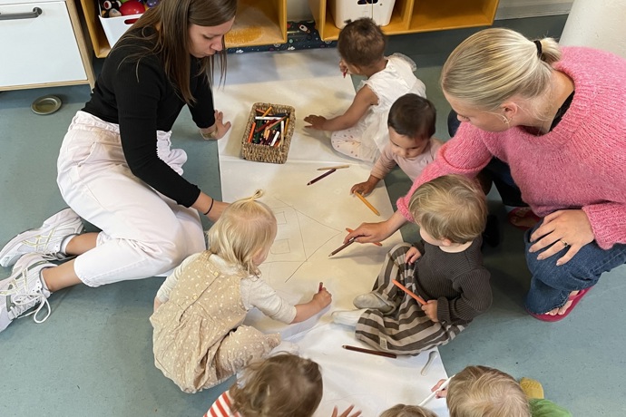 Vi er en integreret institution normeret til 17 vuggestuebørn og 30 børnehavebørn med tre pædagoger og en studerende i vuggestuen samt fire pædagoger i børnehaven og en medhjælper, der hjælper i hele huset.