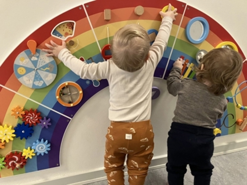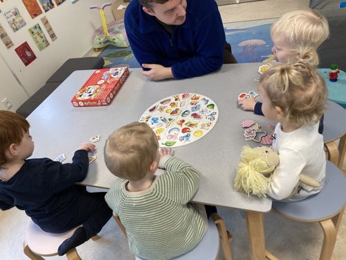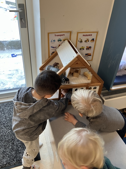 Vi fordeler børnene i vuggestuegruppe og børnehavegruppe og laver aktiviteter med børnene.