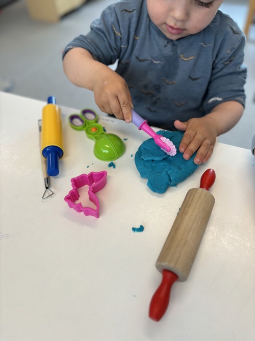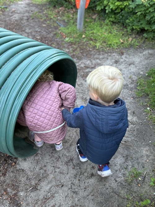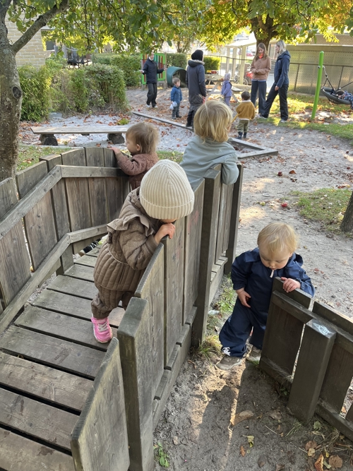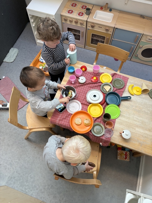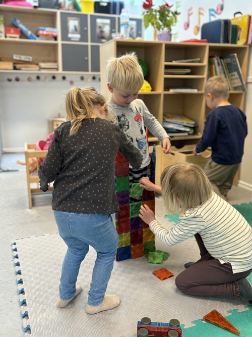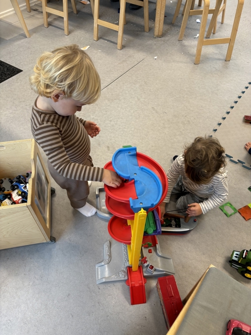 Vi rykker stille og roligt ind på stuerne og leger, mens flere børn modtages. Personalet prioriterer højt at få sagt goddag til både børn og forældre.