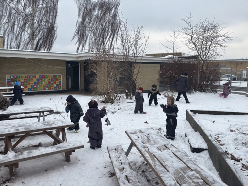 Udenfor har vi for nyligt fået indrettet vores legeplads i to sektioner, hvor en er indrettet med klatrestativ, gynge og rutsjebane til de yngste og en sektion med klatrestativ, gynger og rutsjebane til de ældste børn.