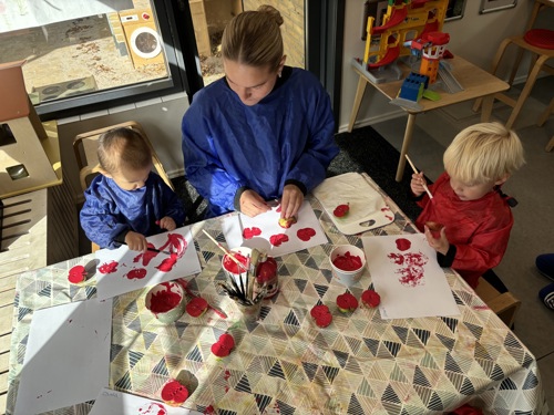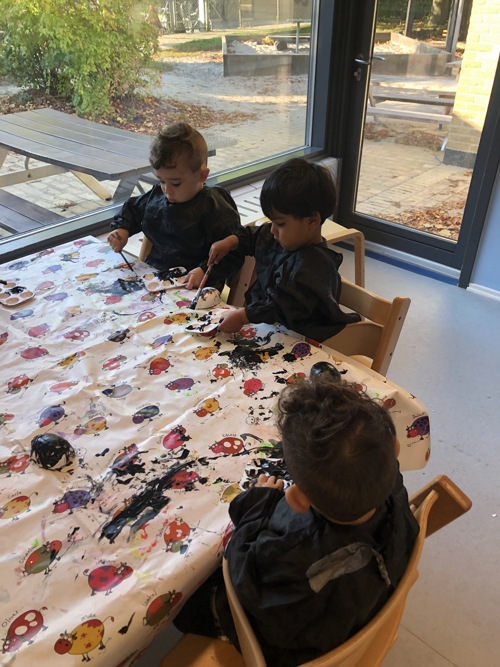 Vi prioriterer børnenes sproglige udvikling gennem musik, sang og bevægelse og kreativitet har også en stor plads i vores hus, bl.a. i vores værksted, hvor børnene saver, hamrer søm i og maler.