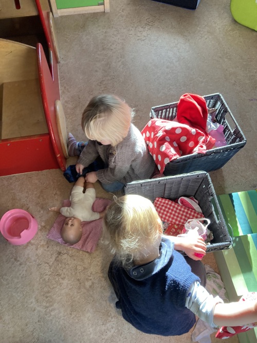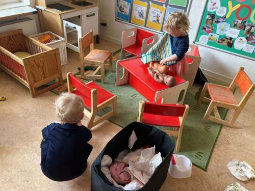 Vi fordeler os på børnenes egne stuer og laver aktiviteter som fx at læse bøger eller lege.