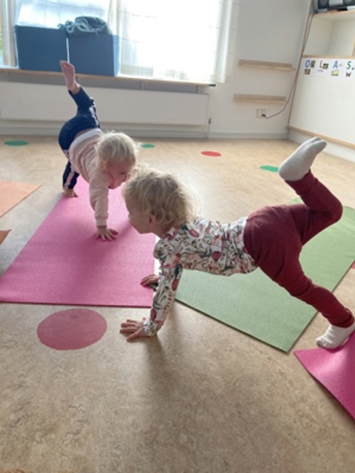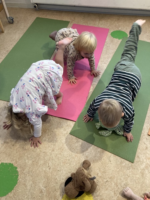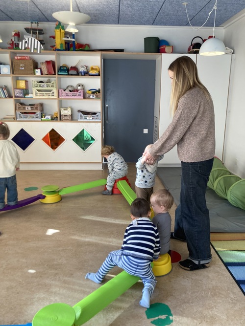 De ældste fra hver stue er samlet om formiddagen i "Gruppen på tværs". Her får børnene mulighed for målrettede og alderssvarende aktiviteter, og vi fokuserer på at styrke børnenes selvhjulpenhed og selvregulering som fx at vente på tur, lytte, sige til og fra.